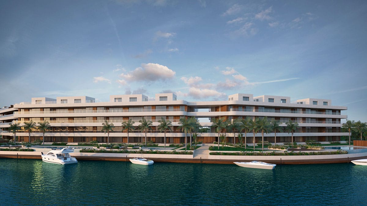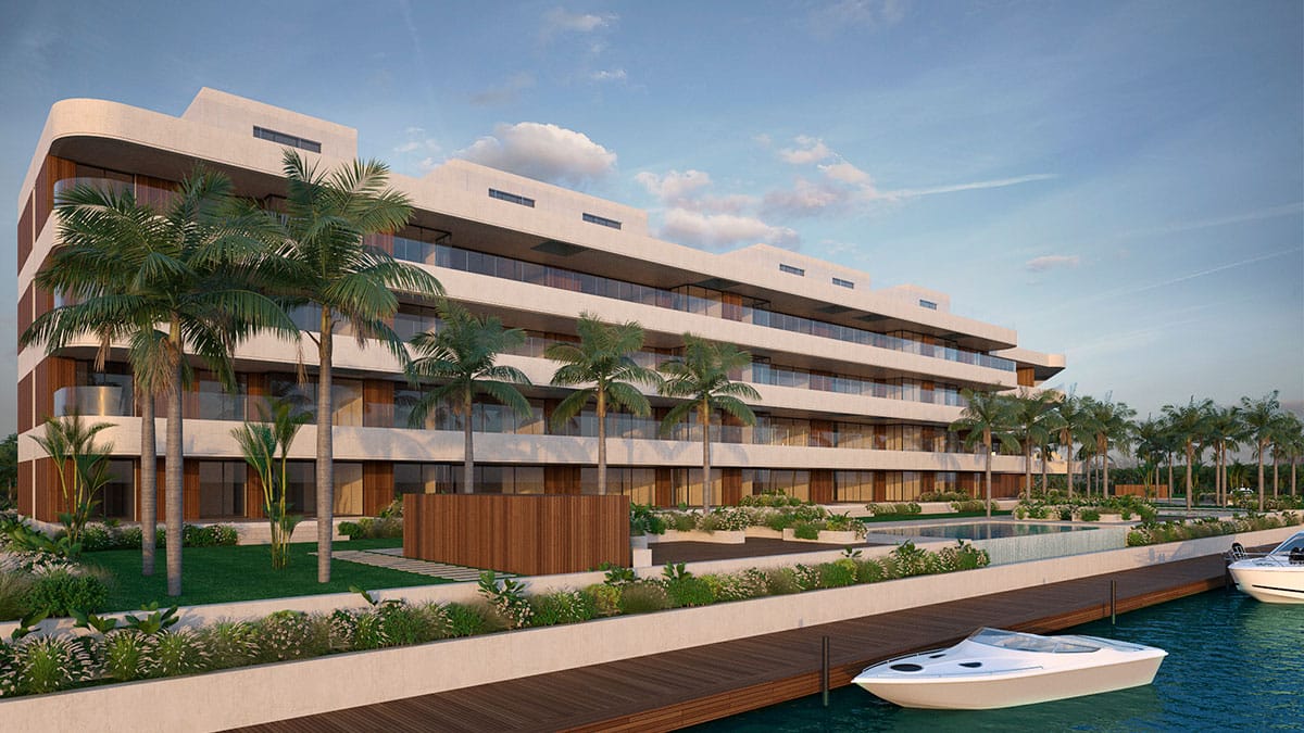 La propuesta integra arquitectura contemporánea, paisajismo y espacios comunitarios, incorporando piscinas y jardines exteriores diseñados para potenciar la relación con el entorno natural y la marina.