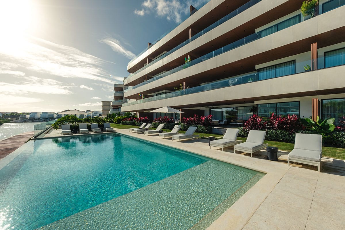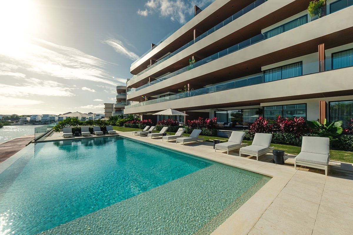 Su arquitectura de líneas horizontales se abre al paisaje, potenciando las vistas a la Marina de Cap Cana y Playa Juanillo.