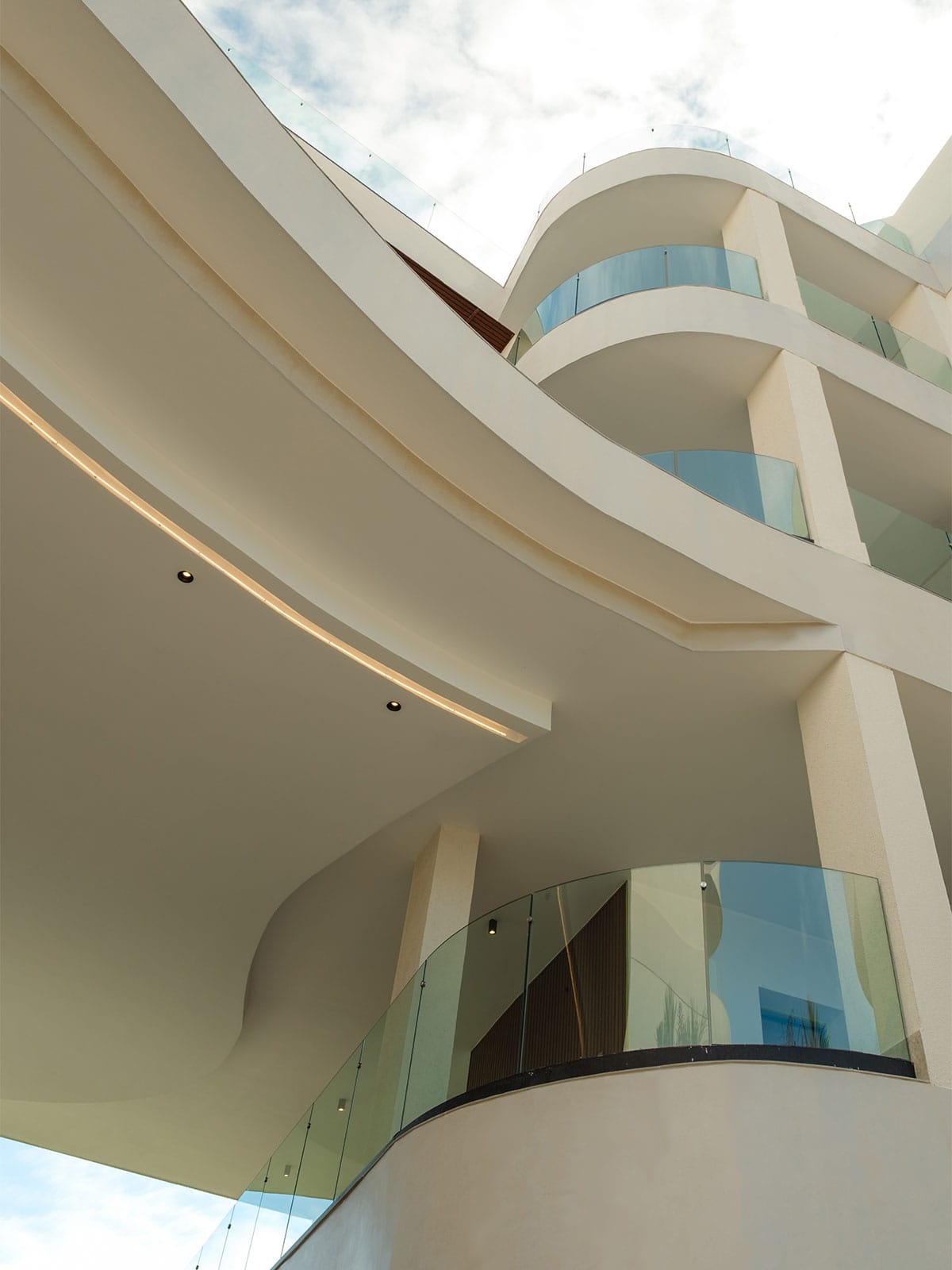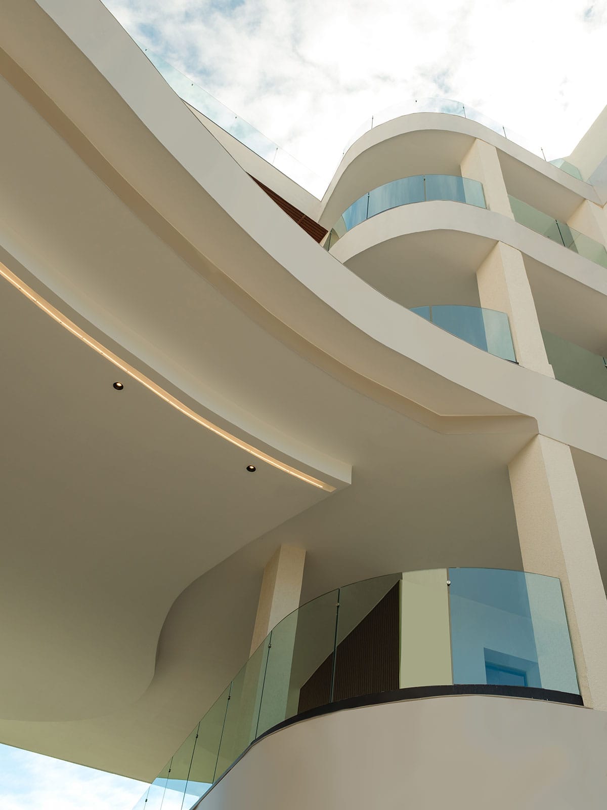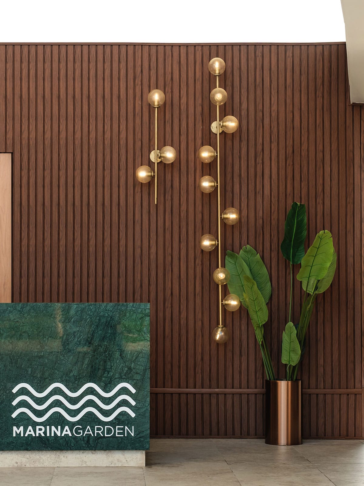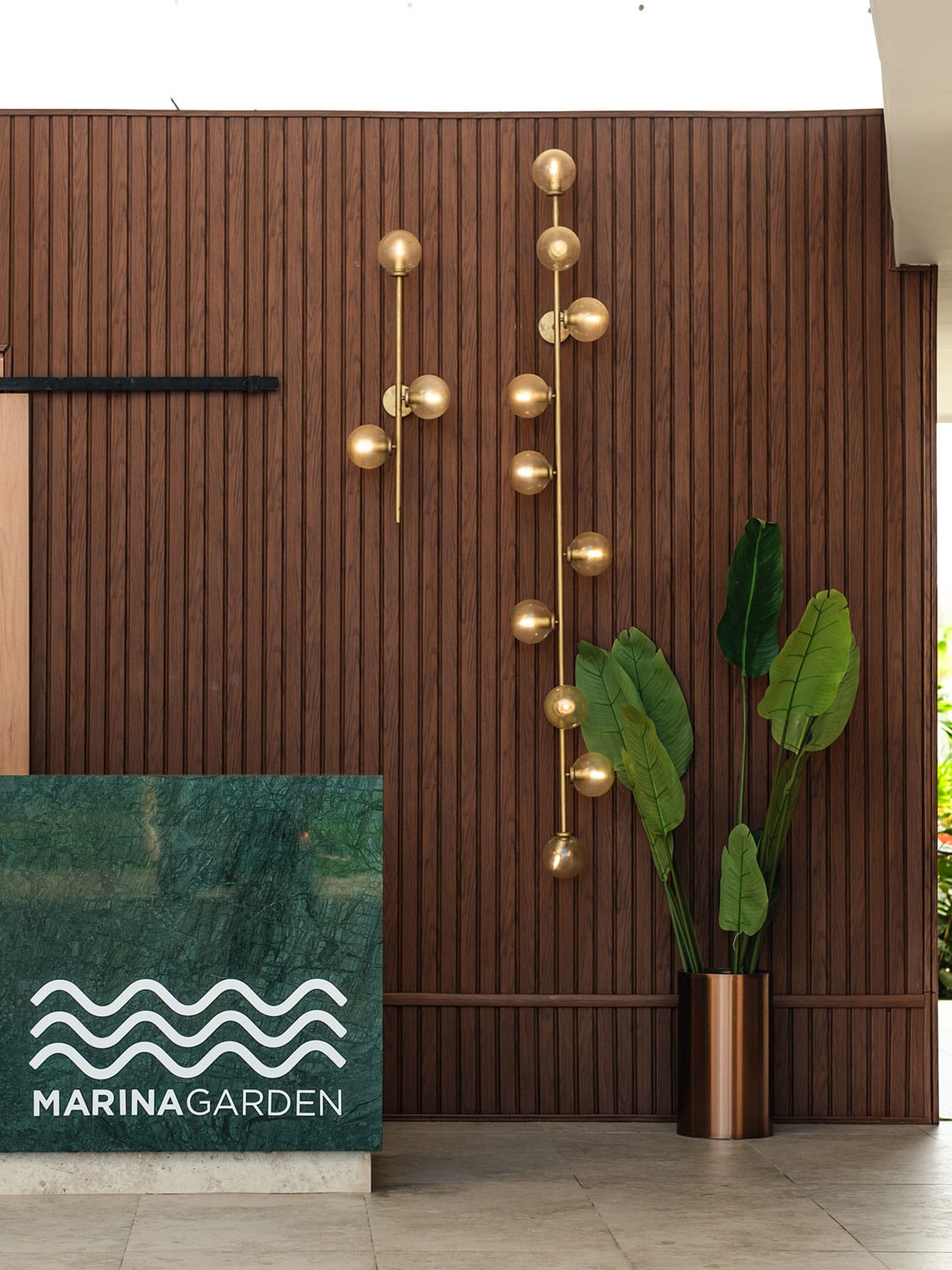 Es el diseño de interiorismo y ejecución del Hall de un edificio de 40 apartamentos y 15 penthouses con gimnasio, 2 piscinas desbordantes, zonas de barbacoa y acceso a las playas de la marina.