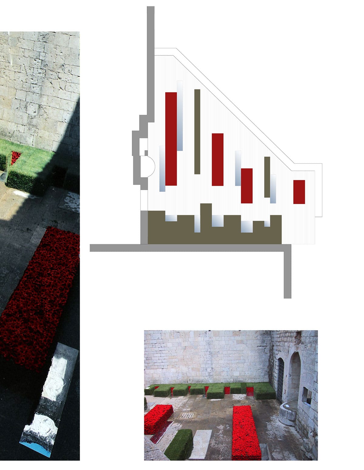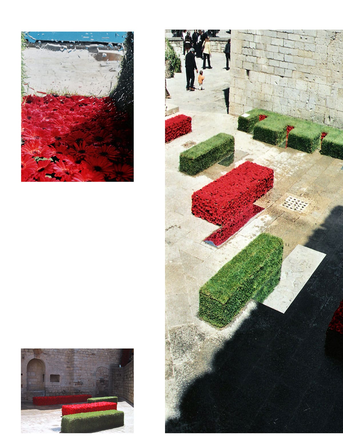 Instalación efímera y artística creada con vegetación y flores como parte del festival de muestras florales “Temps de Flors” que busca un impacto emocional y sensorial mediante el contraste de elementos, materiales y texturas dentro de la pequeña plaza del monasterio Sant Pere de Galligants