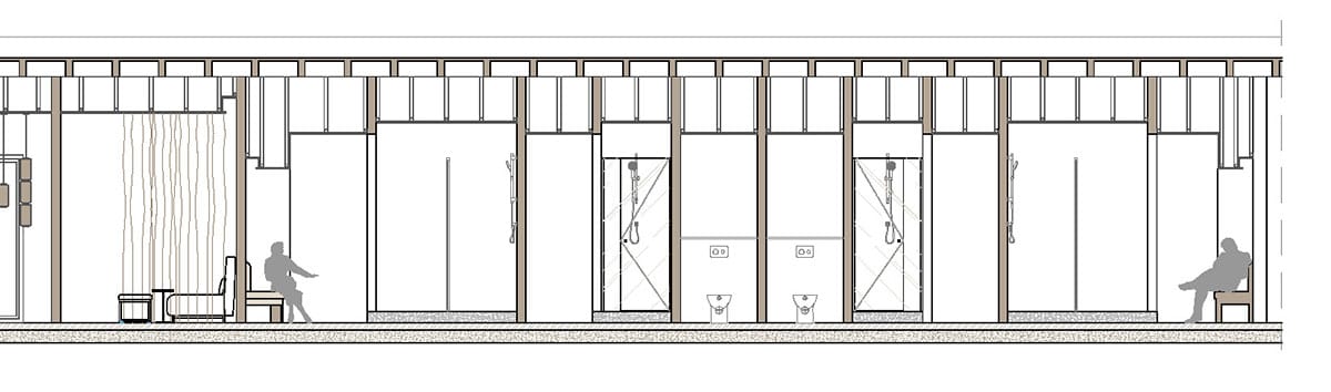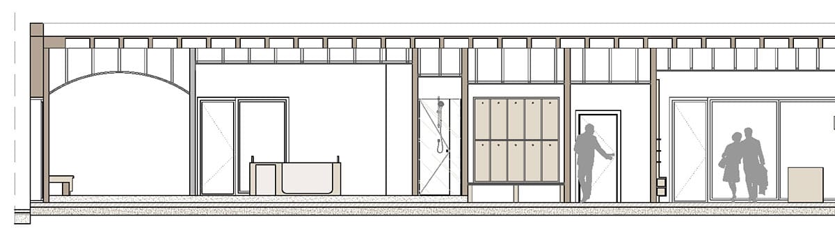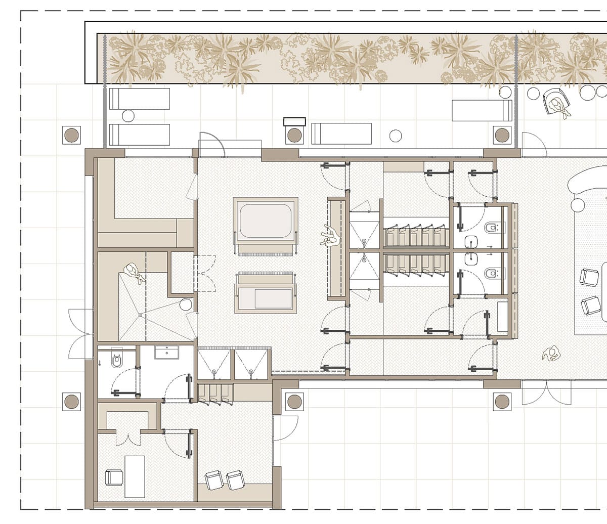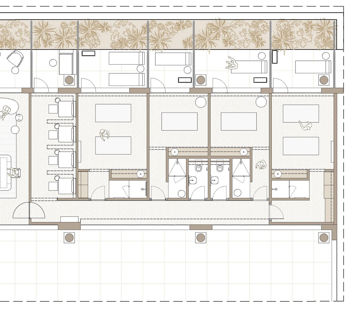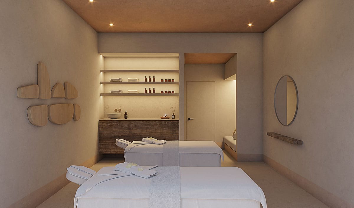 La propuesta se organiza mediante una secuencia clara de usos; recepción, áreas de relajación, cabinas de tratamiento y zona húmeda articuladas a través de circulaciones fluidas y transiciones suaves.